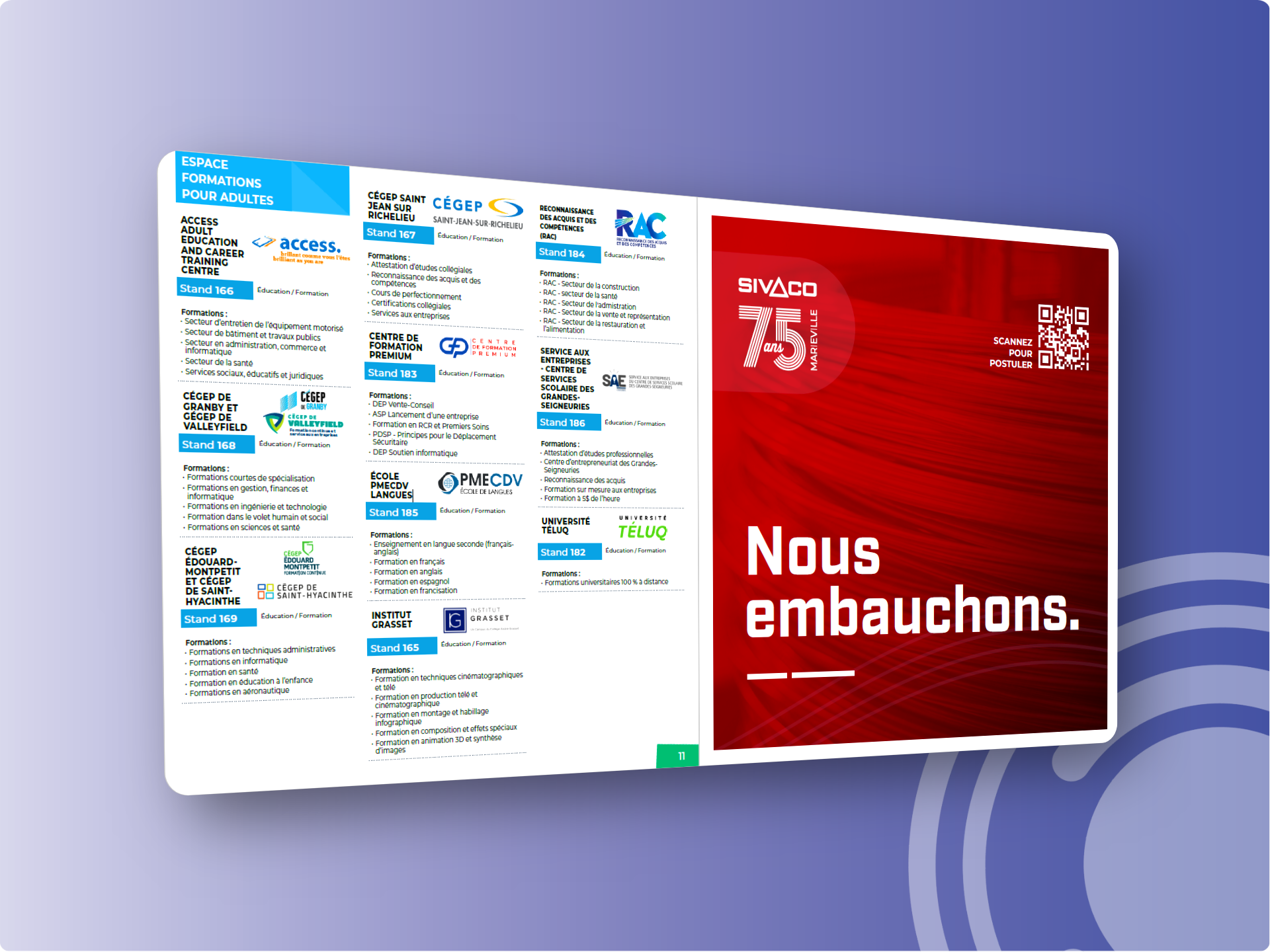 Publicaton sur la page Facebook de L’Événement Carrières + logo de votre entreprise sur le superplan de l’événement + 1/2 page de publicité dans le programme de la journée de l’emploi.